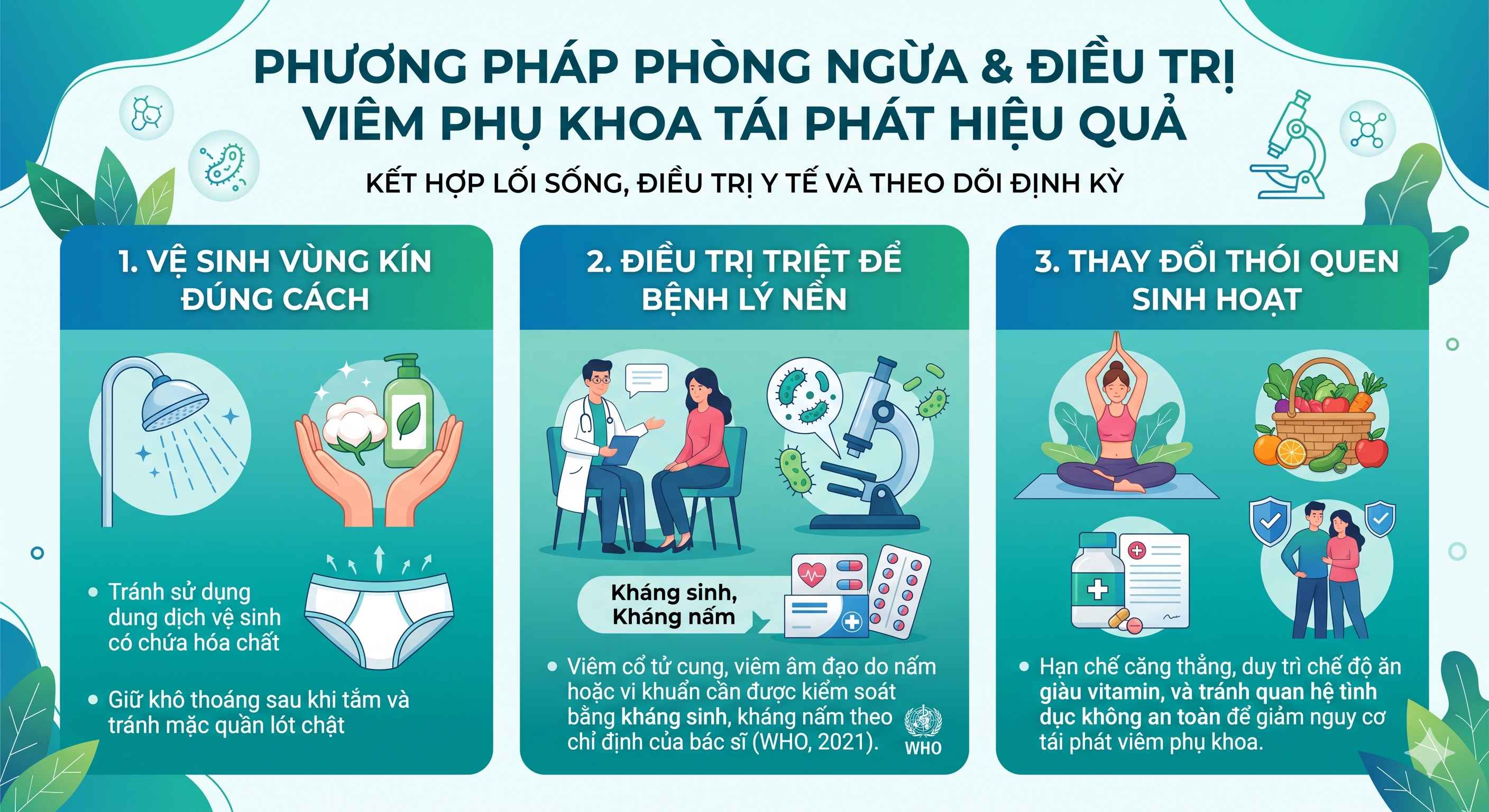Phương pháp phòng ngừa và điều trị hiệu quả viêm phụ khoa tái phát cần kết hợp giữa thay đổi lối sống, điều trị y tế đúng cách và theo dõi định kỳ. Dưới đây là các biện pháp được khuyến nghị: