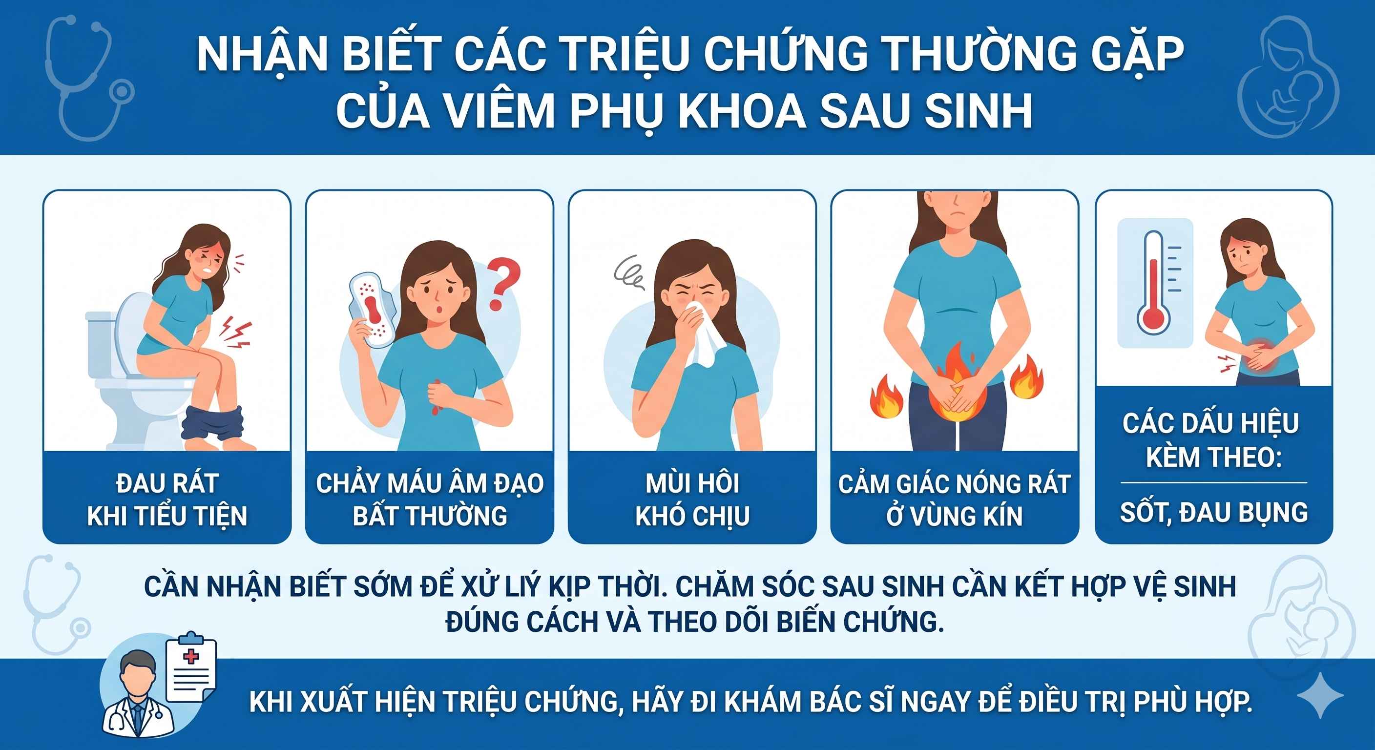 Theo dõi sức khỏe định kỳ tại cơ sở y tế là biện pháp hiệu quả, giúp phát hiện sớm triệu chứng viêm phụ khoa khi mang thai như đau âm ỉ, tiết dịch bất thường. Việc điều trị viêm phụ khoa cho bà bầu cần được thực hiện dưới sự hướng dẫn của bác sĩ, tránh dùng thuốc không đúng cách gây ảnh hưởng đến thai nhi.