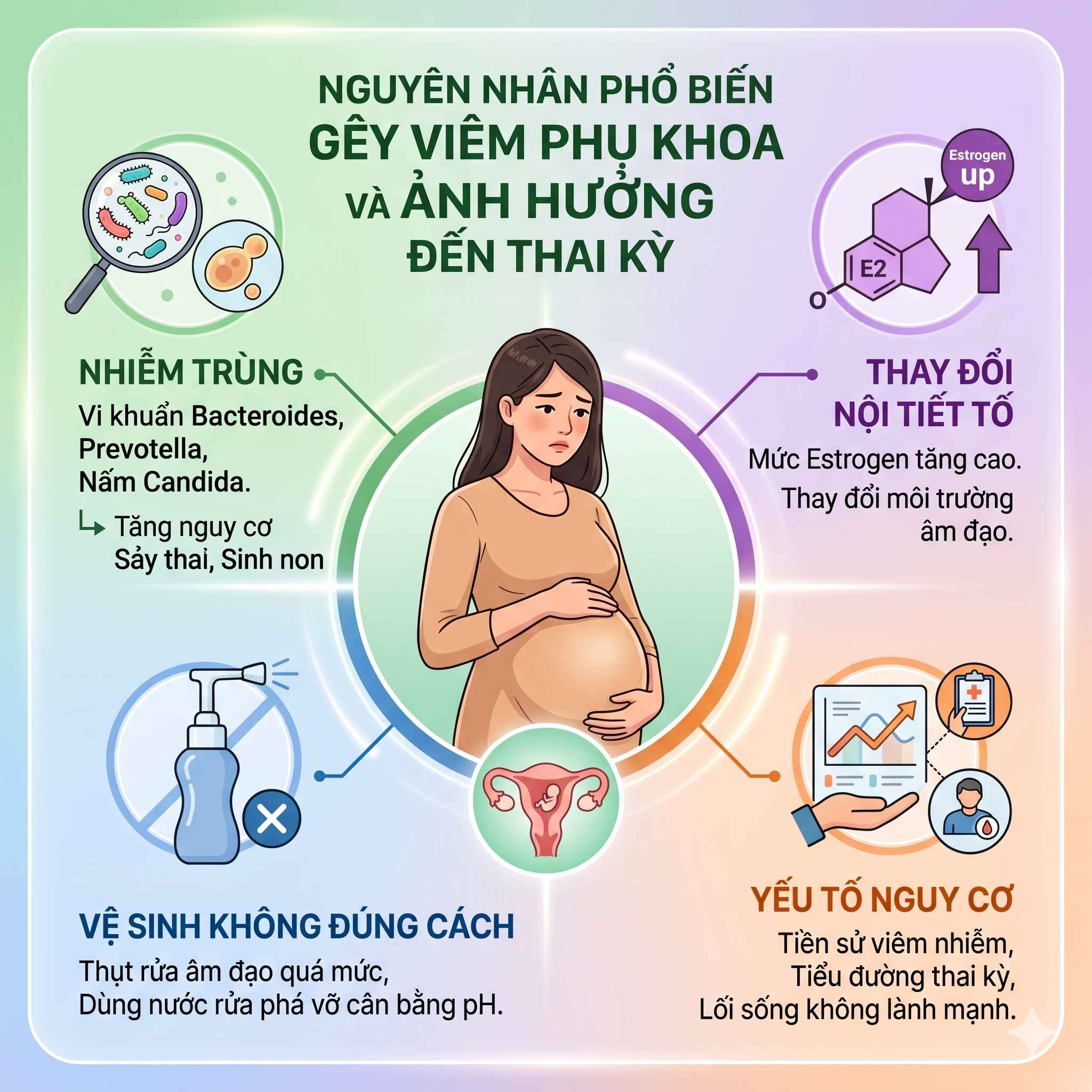 - Thay đổi nội tiết tố: Mức estrogen tăng trong thai kỳ làm thay đổi môi trường âm đạo, dễ dẫn đến nhiễm trùng.